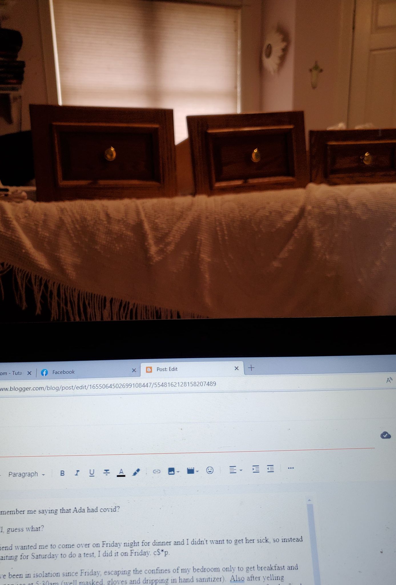 So I've been in isolation since Friday, escaping the confines of my bedroom only to get breakfast and some pop/ice at 5:30am (well masked, gloves and dripping in hand sanitizer).  Also after yelling downstairs that I'm coming down, giving them ample time to get the heck out of my way, for the food that either Meri brings over, Jen makes and leaves outside my door or some canned food.  I'm snacking on some canned coleslaw right now. YUM!