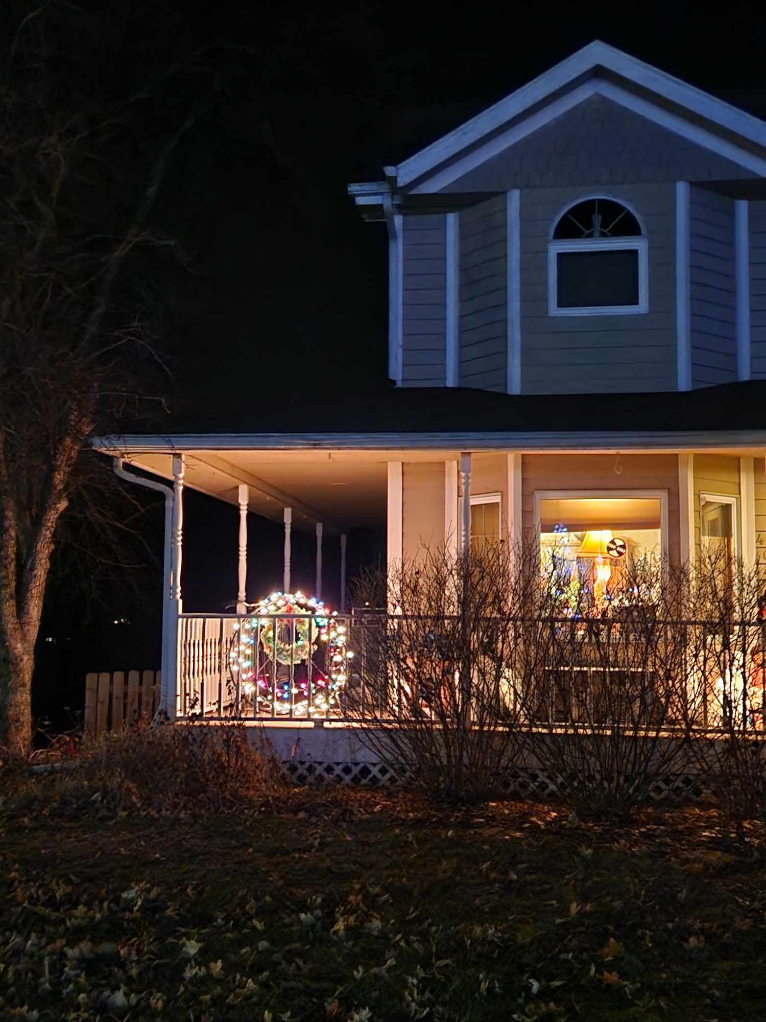 The circle light thingy was inspired by a decoration I saw at our local Earl May garden center. I had found a log holder at a garage sale last summer, so I strung it up with lights and positioned a plasticky wreath in the center with lights too. At night it looks pretty cool! And then of course, Robb's leg lamp in the window.